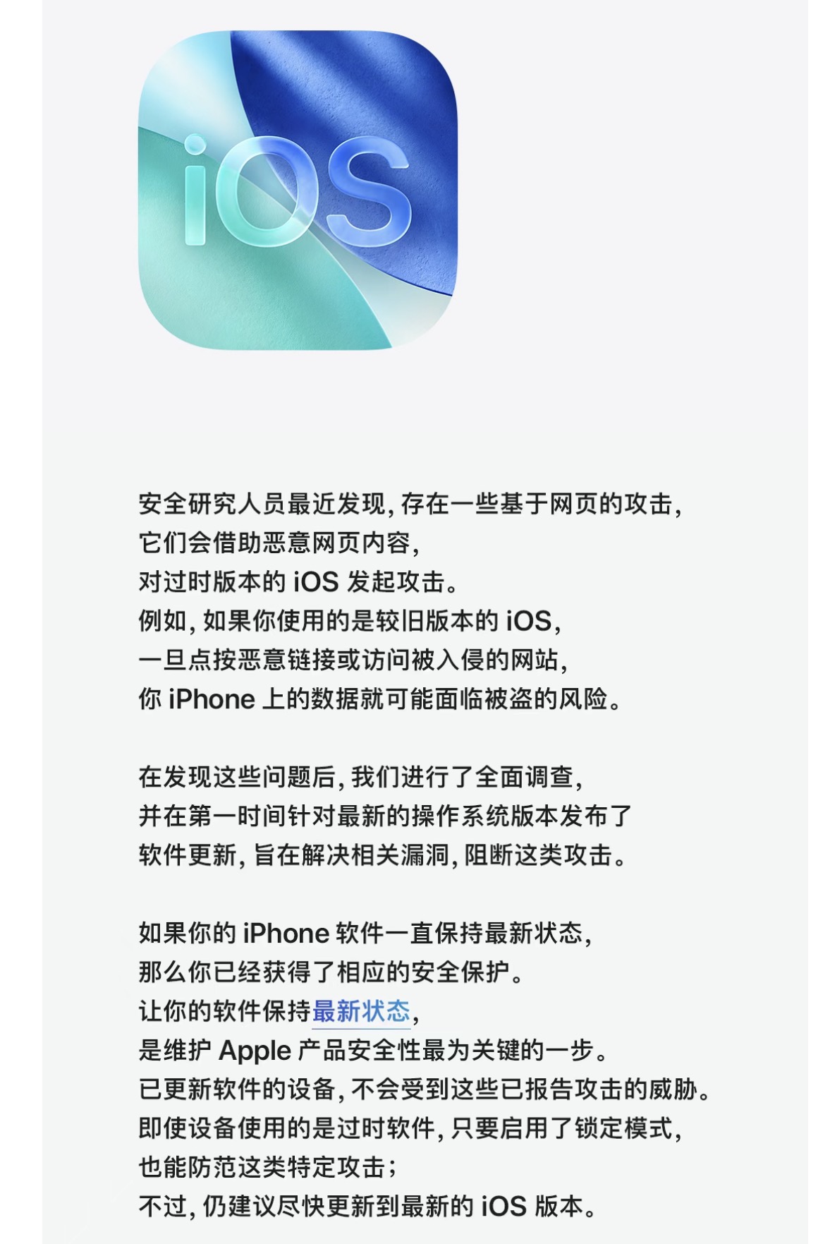 提示称,如果用户的iPhone软件一直保持最新状态,那么已经获得了相应的安全保护。让软件保持最新状态,是维护Apple产品安全性最为关键的一步。已更新软件的设备,不会受到这些已报告攻击的威胁。即使设备使用的是过时软件,只要启用了锁定模式,也能防范这类特定攻击;不过,仍建议尽快更新到最新的iOS版本。