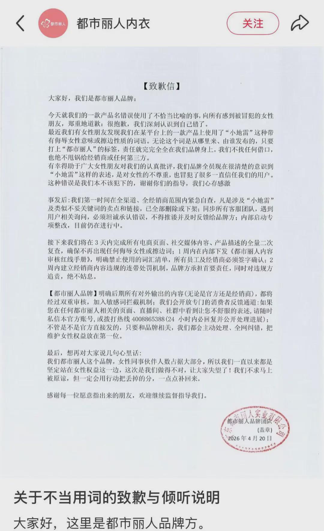 针对此事,4月20日晚,都市丽人在官方账号发布致歉声明。都市丽人表示,深刻认识到自己错了,并表示,“小地雷”这种词语带有侮辱女性意味或擦边性质,无论这个词是从哪里来、由谁发布的,只要打上“都市丽人”的标签,责任就完完全全在品牌身上,“我们不找任何借口,也绝不甩锅给经销商或任何第三方”。