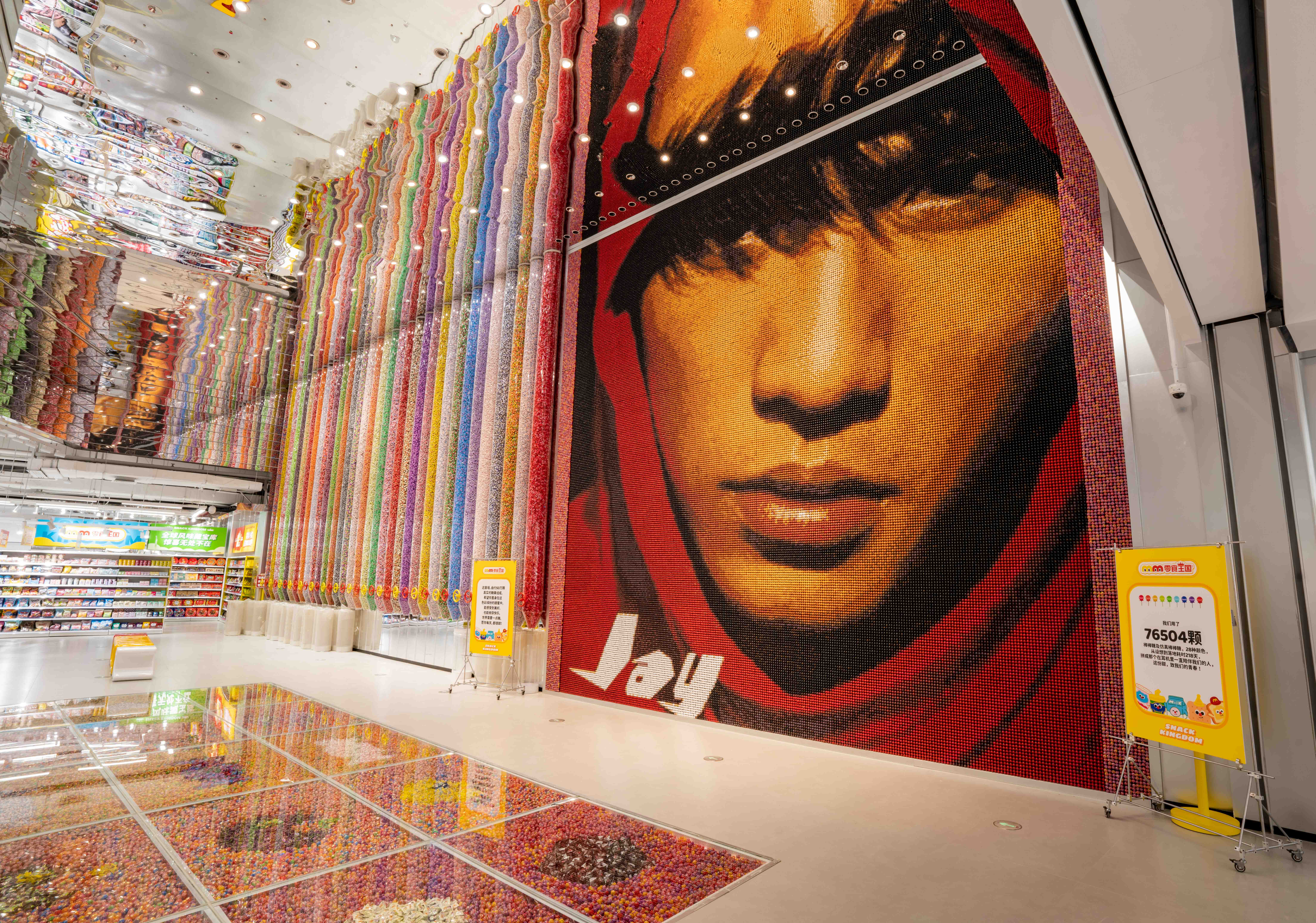 以棒棒糖墙为例,这是一面由7万余根棒棒糖拼制而成的巨幅装置,复刻周杰伦经典专辑《范特西》封面,韩国电影姐姐“糖果管道”则由34根透明管道构成,内部装填约50万颗真实糖果,形成强视觉冲击的场景。